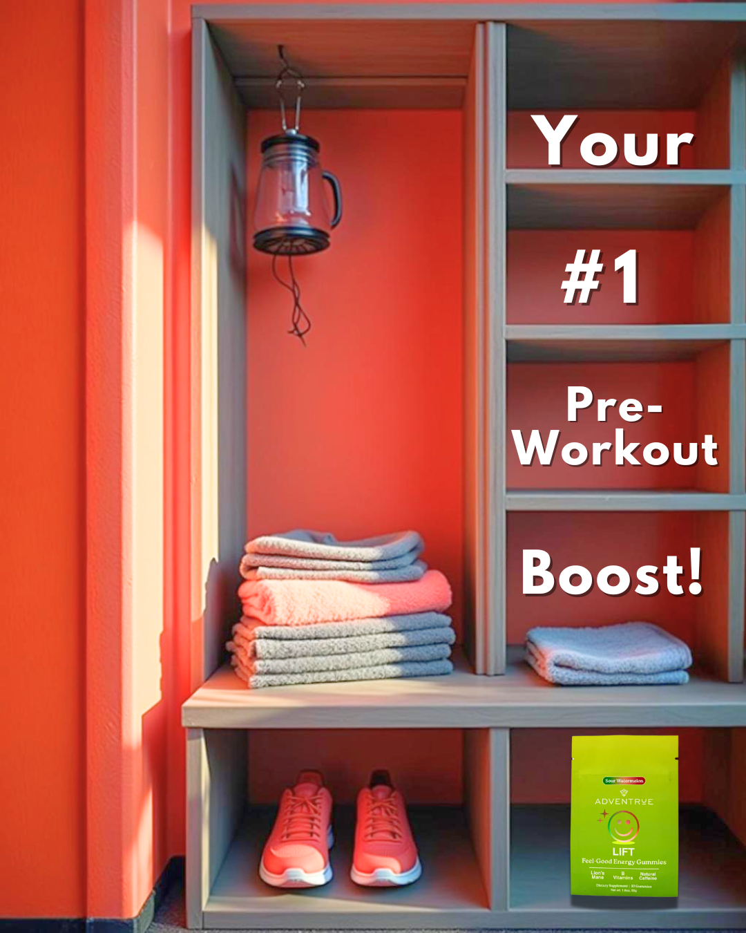 Experience the new height of daily wellness with AdvenTrue's LIFT Gummies. Expertly crafted to promote vitality and a positive state of mind. Each tasty gummy combines the cognitive boost of Lion's Mane functional mushroom, the metabolic support of B-Vitamins, the natural energy of caffeine from smooth green coffee bean extract, and the calming focus of L-theanine. No taste of mushroom or coffee, only the fantastic flavor of watermelon and just a hint of sour kick.